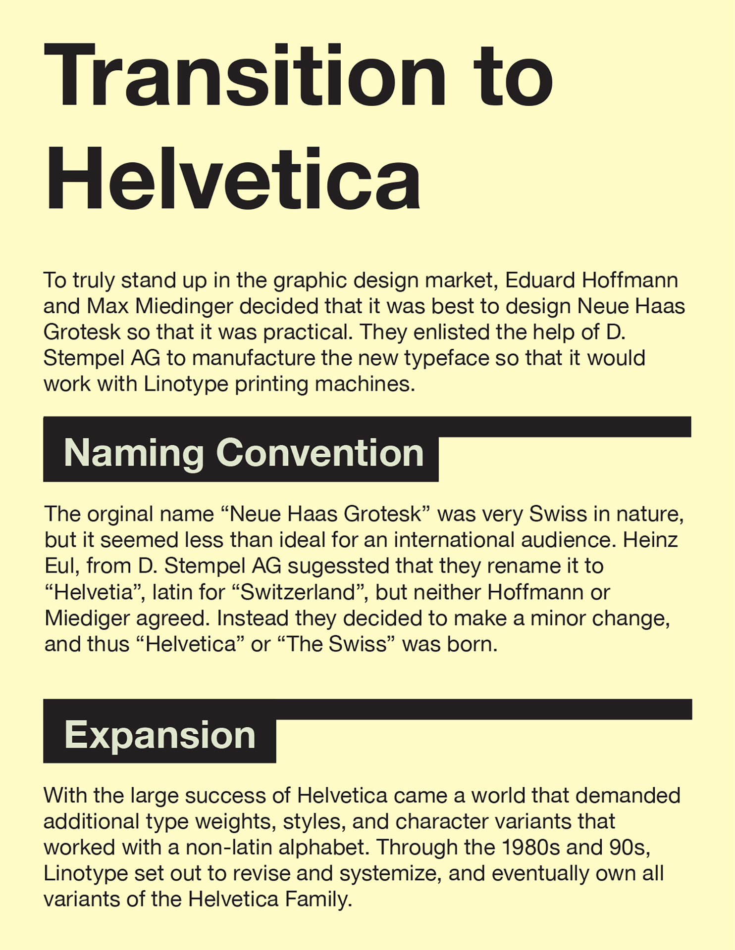 In an effort to meet his goal, Eduard Hoffman reaches out to Max Miedinger, a Swiss typesetter and graphic designer. Max and Eduard's work at the Haas Type Foundary would set a ground breaking typographic standard for the future of graphic design. In order to compete successfully in a demanding industry, they needed to come up with a new name for this new typeface. Thus, after months of debating, research, and type studying, 'Helvetica' was born, and became the new typographic standard for modern design.