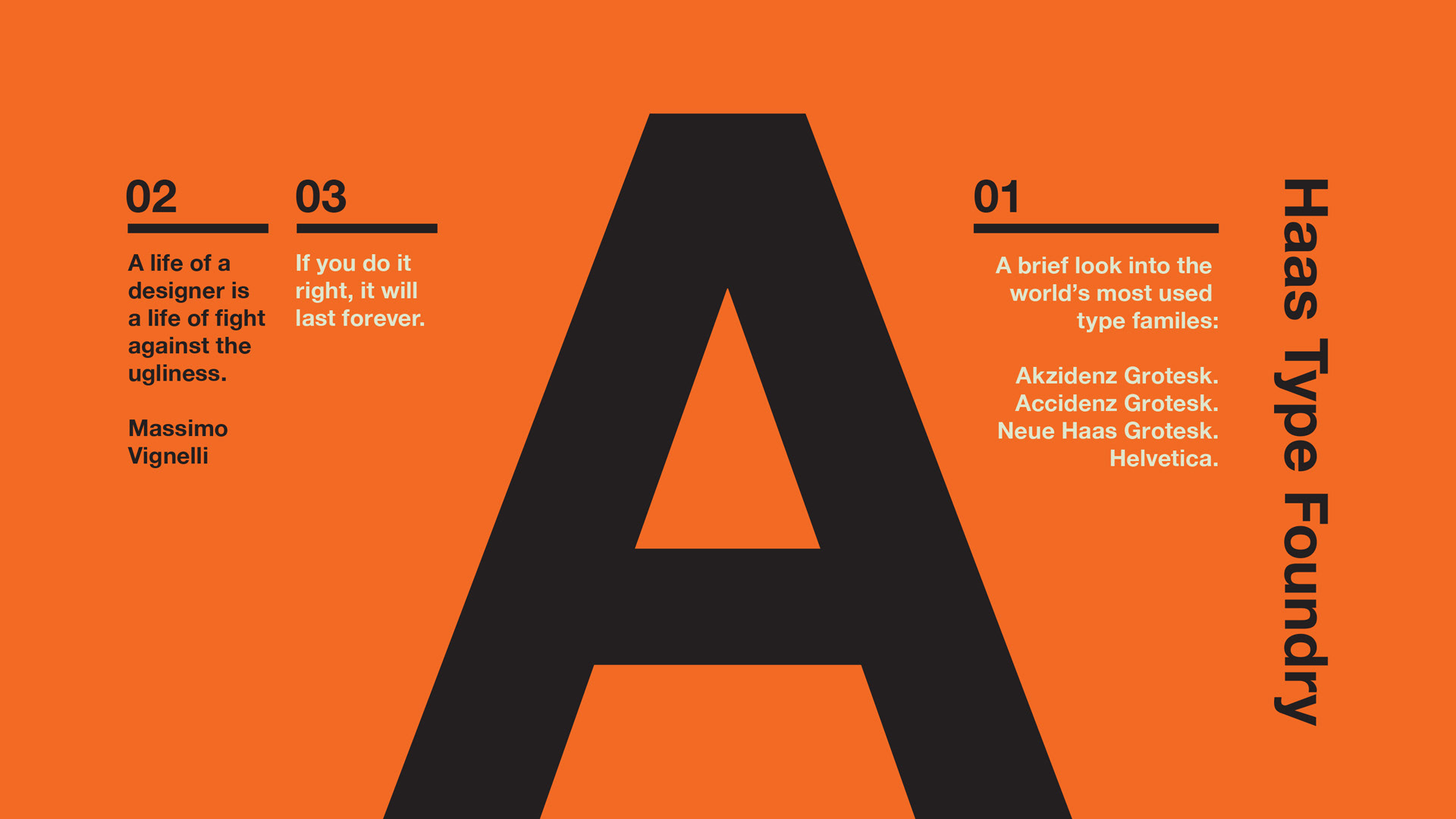 Being inspired by modernist design principles, I have chosen to use a grid layout to neatly organize the content efficiently, guiding the readers through each panel. The color palette takes inspiration from the original 'Die Neue Haas Grotesk' and 'Helvetica' type specimen book written in colaboration with the Haas Type Foundary, Hans Neuberg, and Nelly Rudin in 1963.