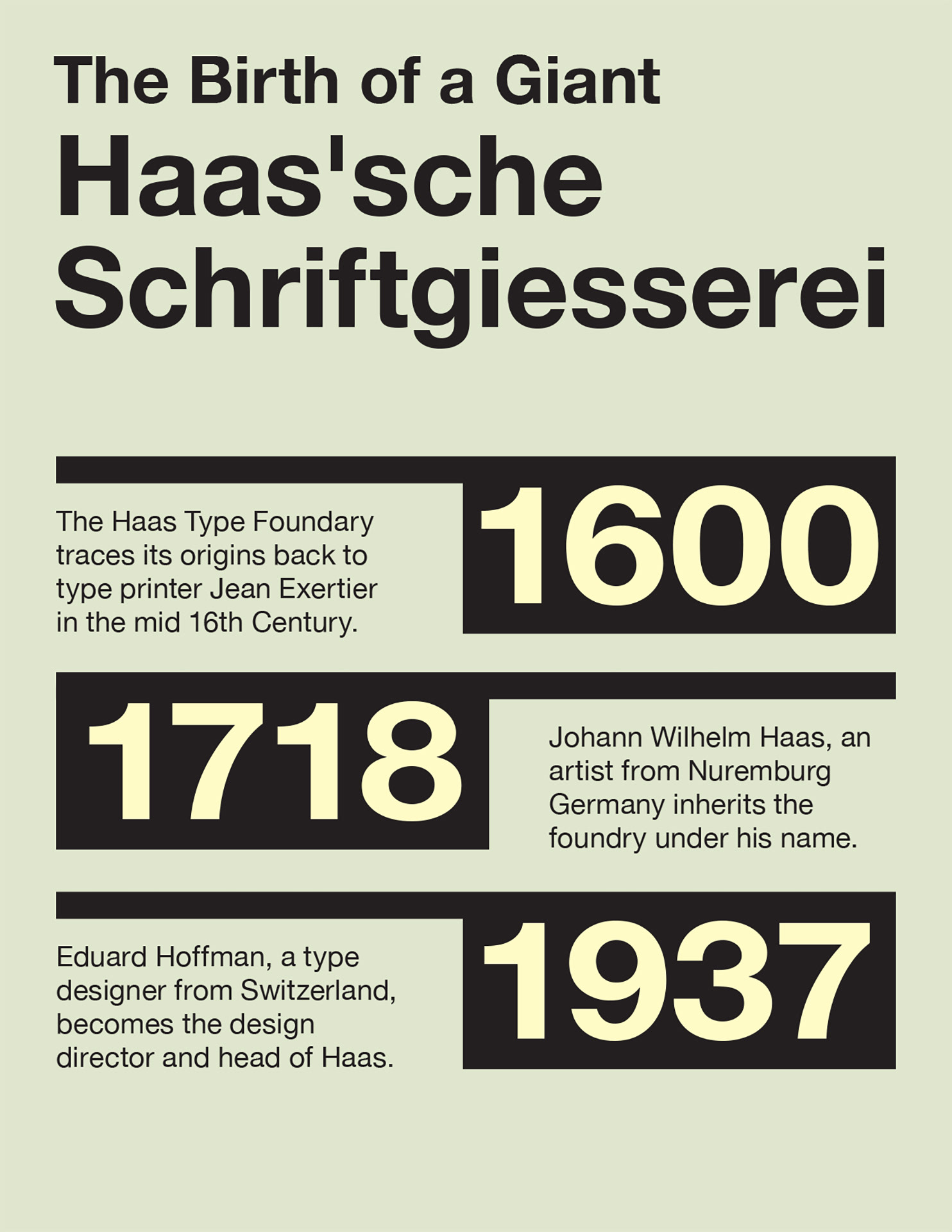 In 1937, Eduard Hoffman, a type designer from Switzerland joins and becomes the creative director of the Haas Type Foundry. It was at this foundry that Eduard Hoffman had a goal to standardize and categorize the Akzidenz-Grotesk type family. Eduard Hoffman saw an opportunity overhaul the Grotesk family in an effort to create a new typeface that could replace, if not surpass current design industry and typographic standards.