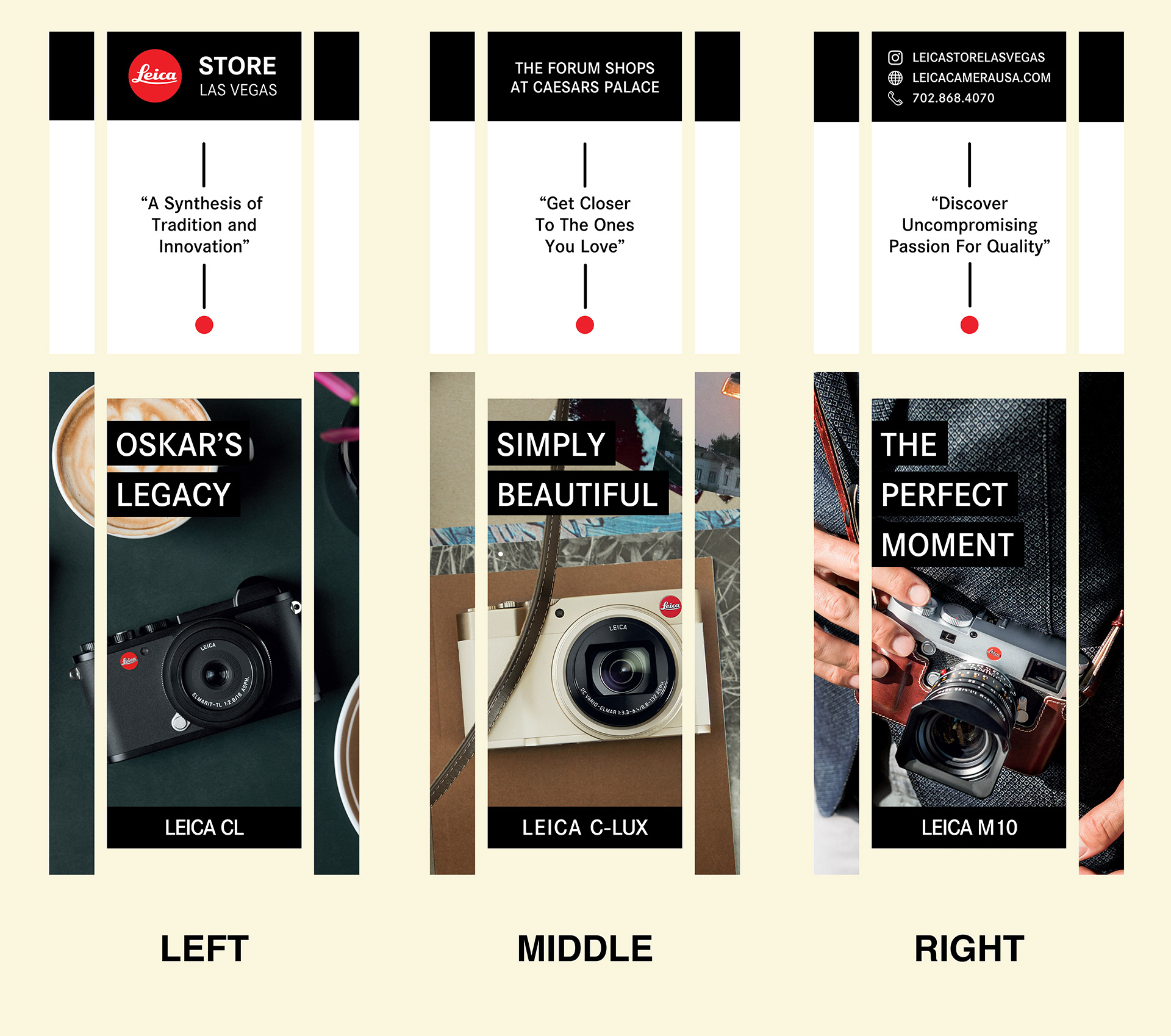 In partnering with Leica Camera Inc. I was commissioned to design external promotional advertisement for the 2018 - 2019 season. With three new Leica Cameras coming out, new promotional materials were required. The objective was not only to generate store foot traffic, but inform new & returning clientele about what Leica Camera has to offer creatives within the photographic market.