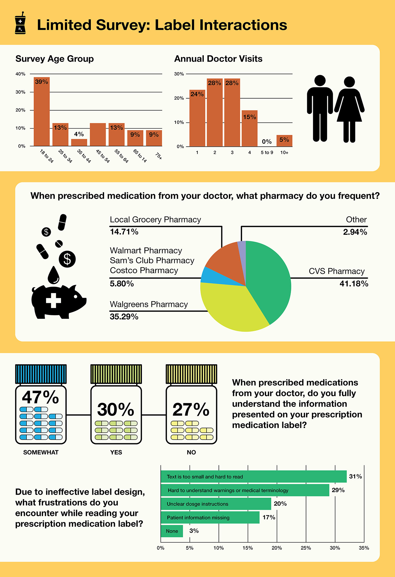 Designing an effective prescription medication label system can be a very difficult task. With over thousands of different pharmaceutical medications out on the market, maintaining consistency throughout will be a challenge. In conducting a patient survey, I have found that the most people would love to see larger type, consistent instructions, and easy to understand medical terminology.