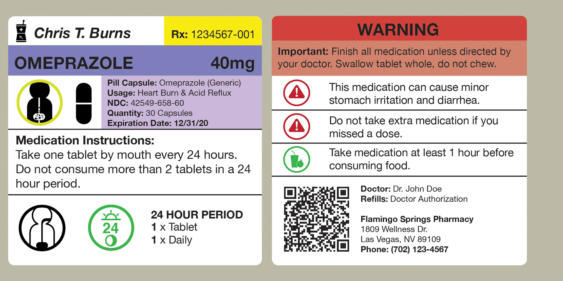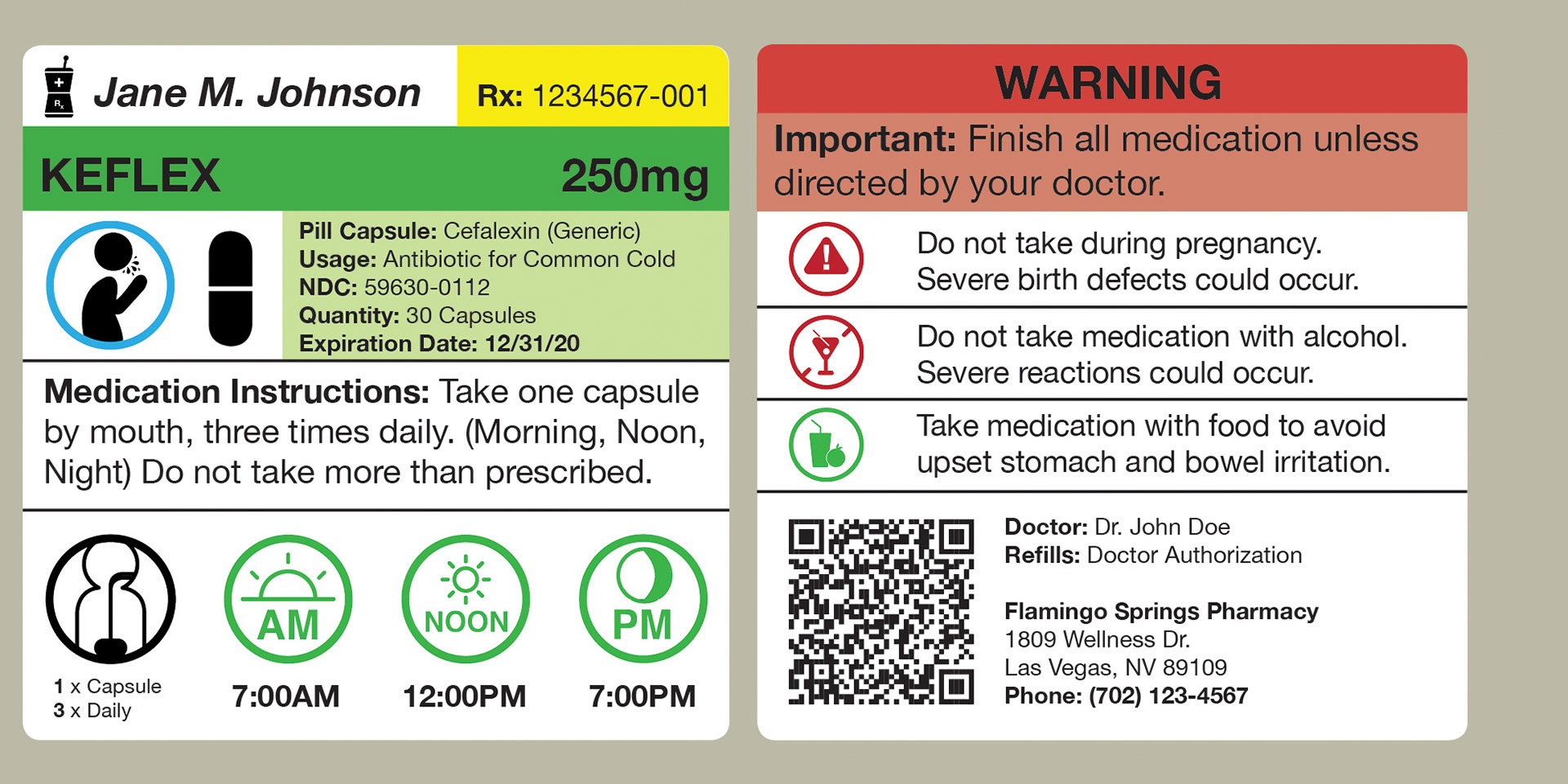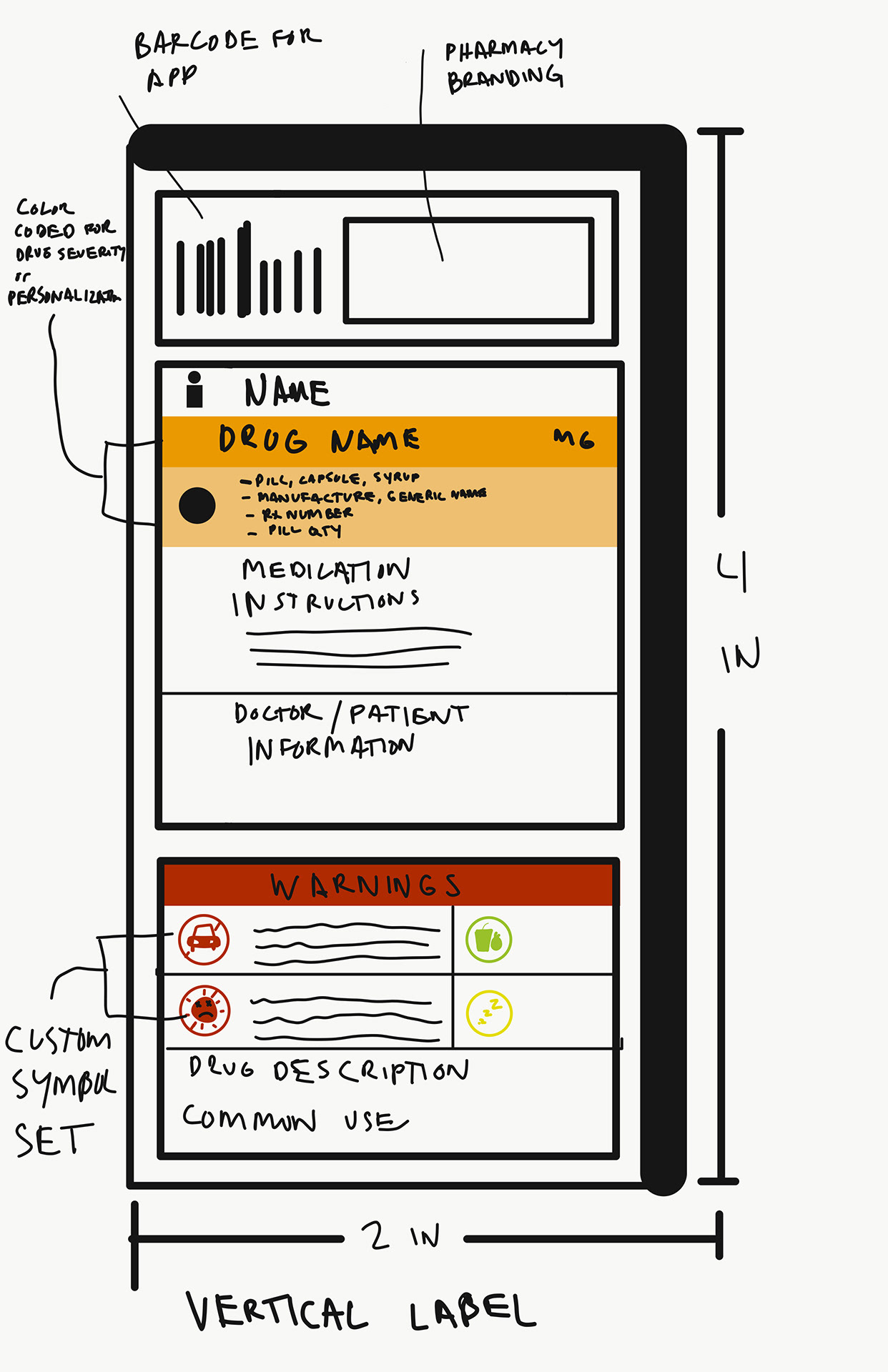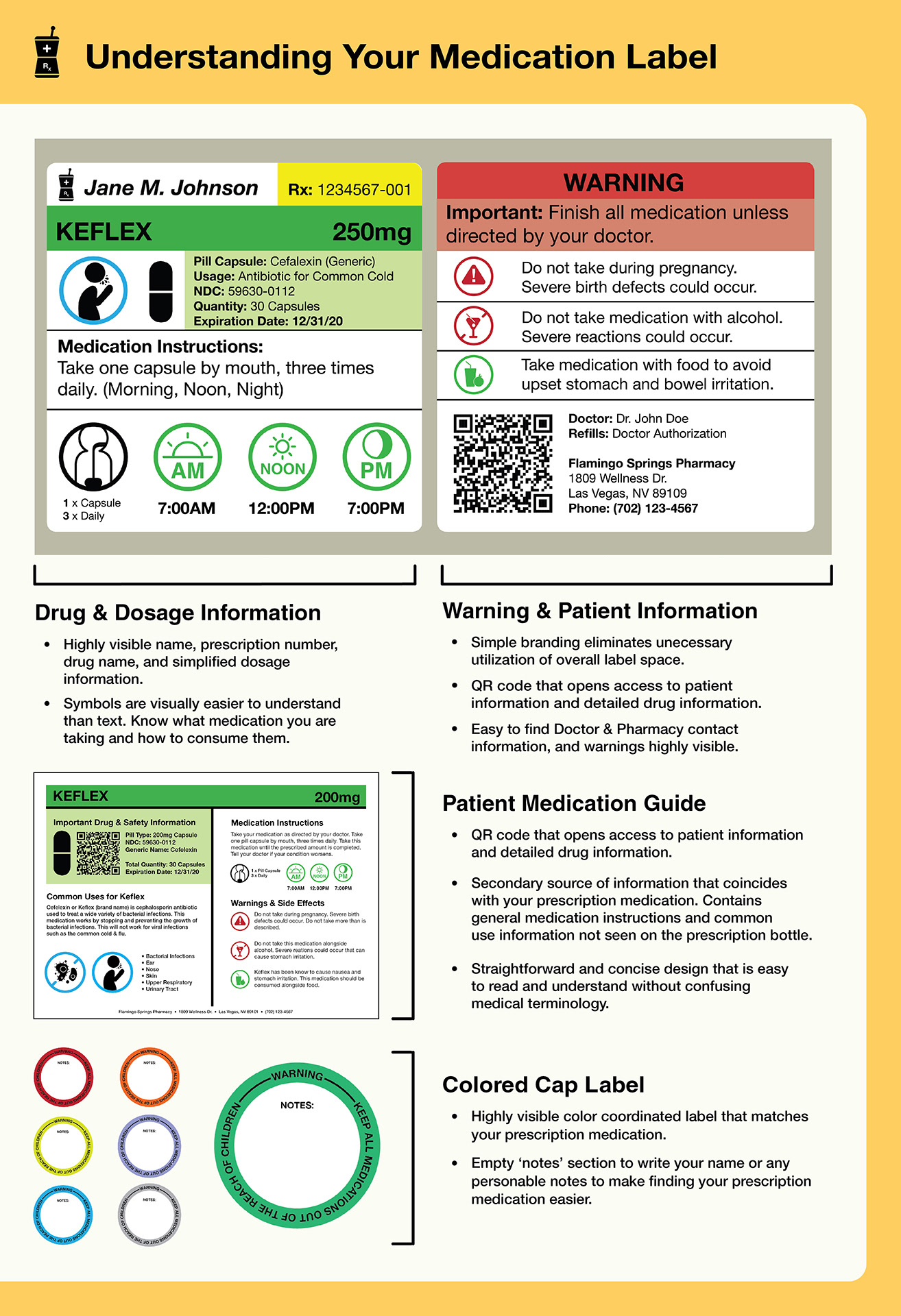 In doing so, I have created a labeling system that utilizes space efficiently, including the essentials and leaving out the unnecessary. Using a symbol system translates well across most language barriers and could potentially make it easier to understand for people that don't speak english. Concise instructions such as dosage and warnings are made clear. If specific drug information, medical terminology, or patient information is needed, a QR code can be scanned easily by any iOS or Android device to access it. An included Patient Medication Guide is also provided alongside your medication that provides additional information about your medication.