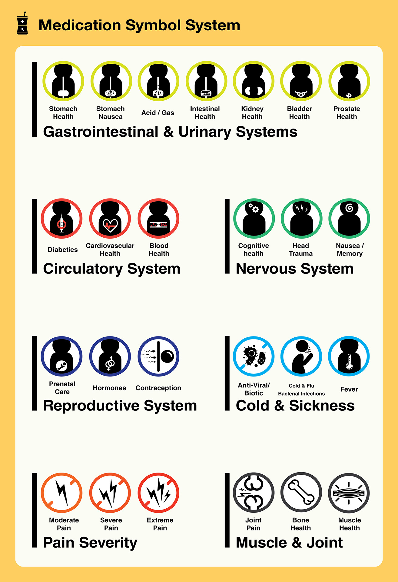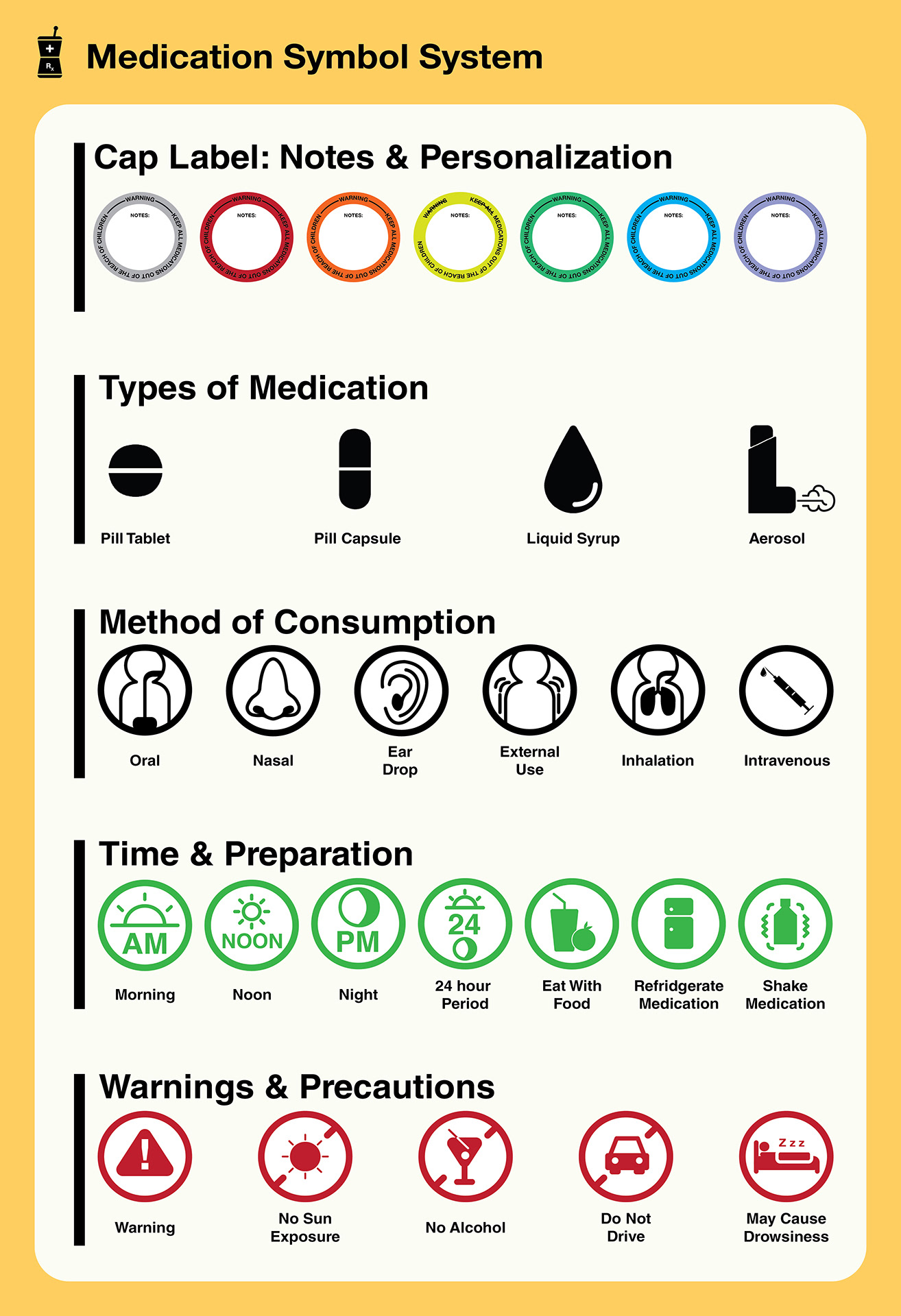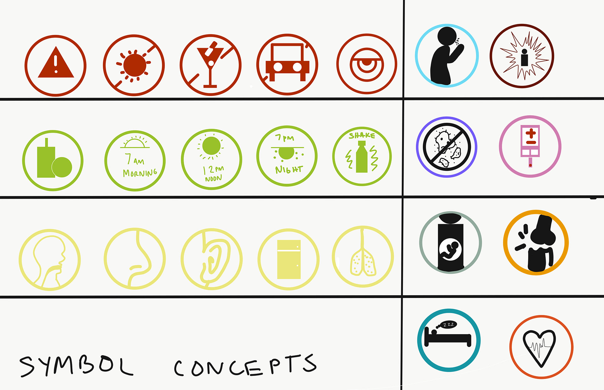 The implementation of a symbol system to help patients find their medication could greatly ensure their safety while consuming their prescribed medications. In some instances where space is limited, symbols could possibly be more effective than text. The implementation of a QR code makes it easy for to access patient and detailed medication information while on the go.