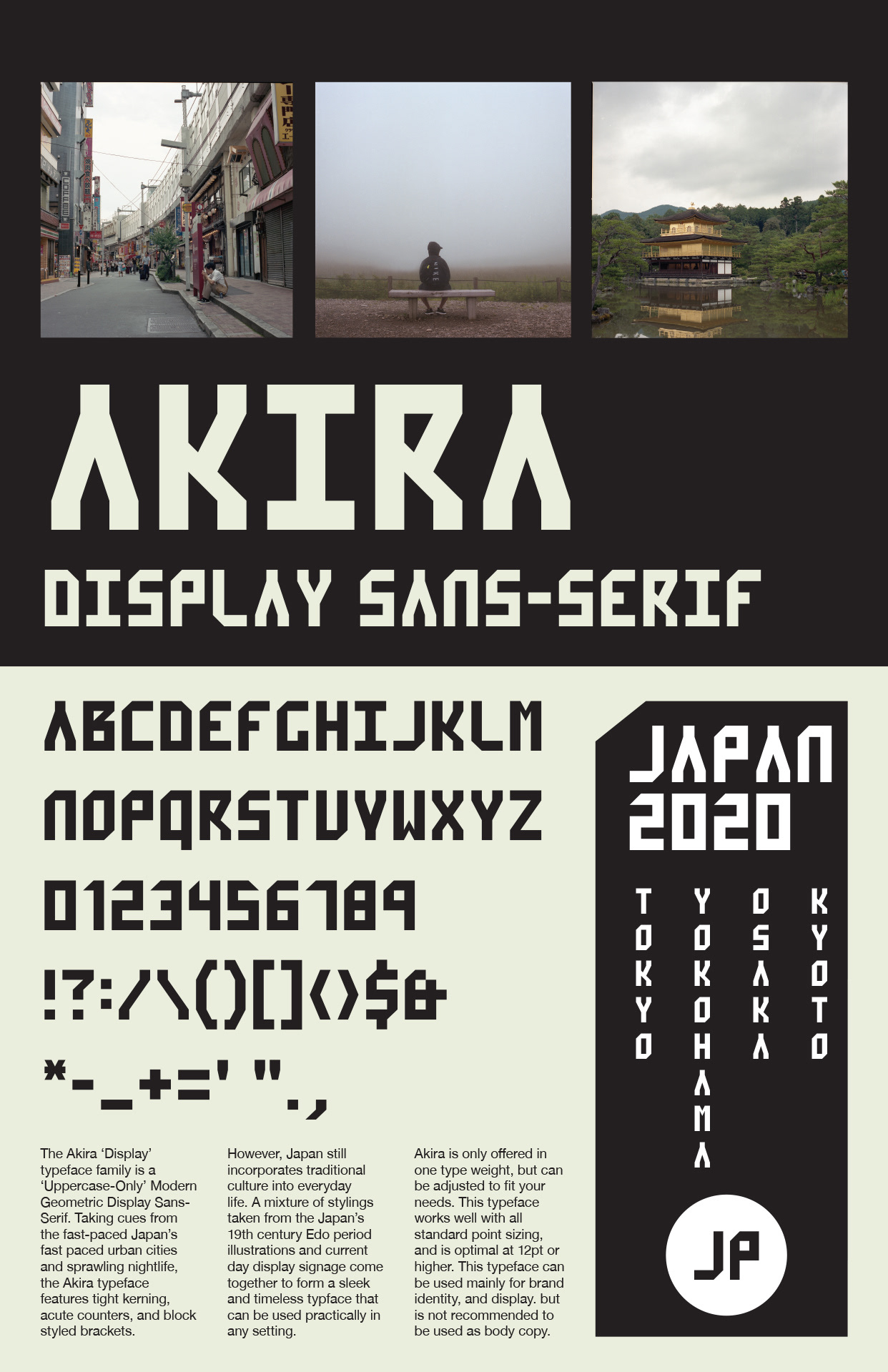 Designing your own typeface can be a rewarding, yet challenging experience. The hardest part is understanding the relationship between character kerning, line-height, X-height, and cap height. Without understanding these principles, designing an effective typeface that communicates with the viewer will be impossible. After many trials and error, I have decided to create a three sans-serif typefaces that are inspired by my all time favorite place to visit in the summer, Japan.